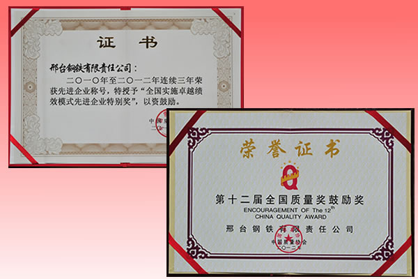 In Octomber, the National Conference on Quest for Performance Excellence was hold in Beijing by China Association for Quality. the topic was quality, credit--sustainable development. Xingtai Steel was awarded National Quality Encouragement Award and Special Prize of National PEM Promotion Advanced Enterprise in the conference.