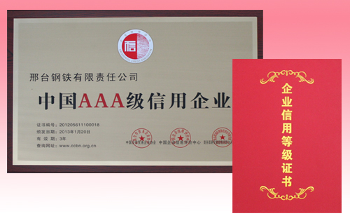 Xingtai Steel was awarded AAA credit rating enterprise of China.