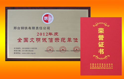 Xingtai Steel was awarded Model units civilized services in China of 2012