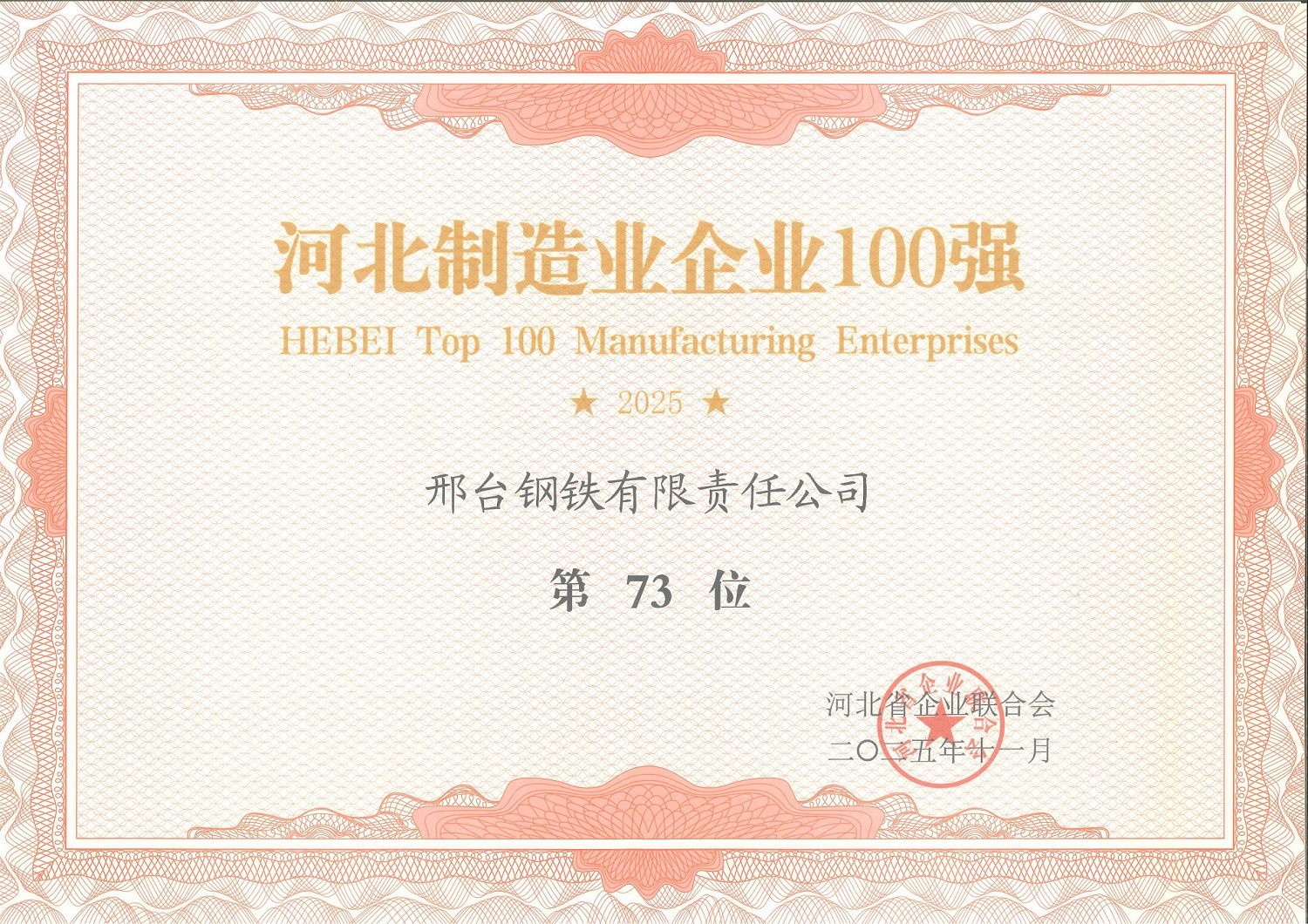 2025年11月,邢鋼在冶金安全電子公文傳輸系統(tǒng)管理工作中表現(xiàn)突出,被中國鋼鐵工業(yè)協(xié)會評為先進(jìn)單位。