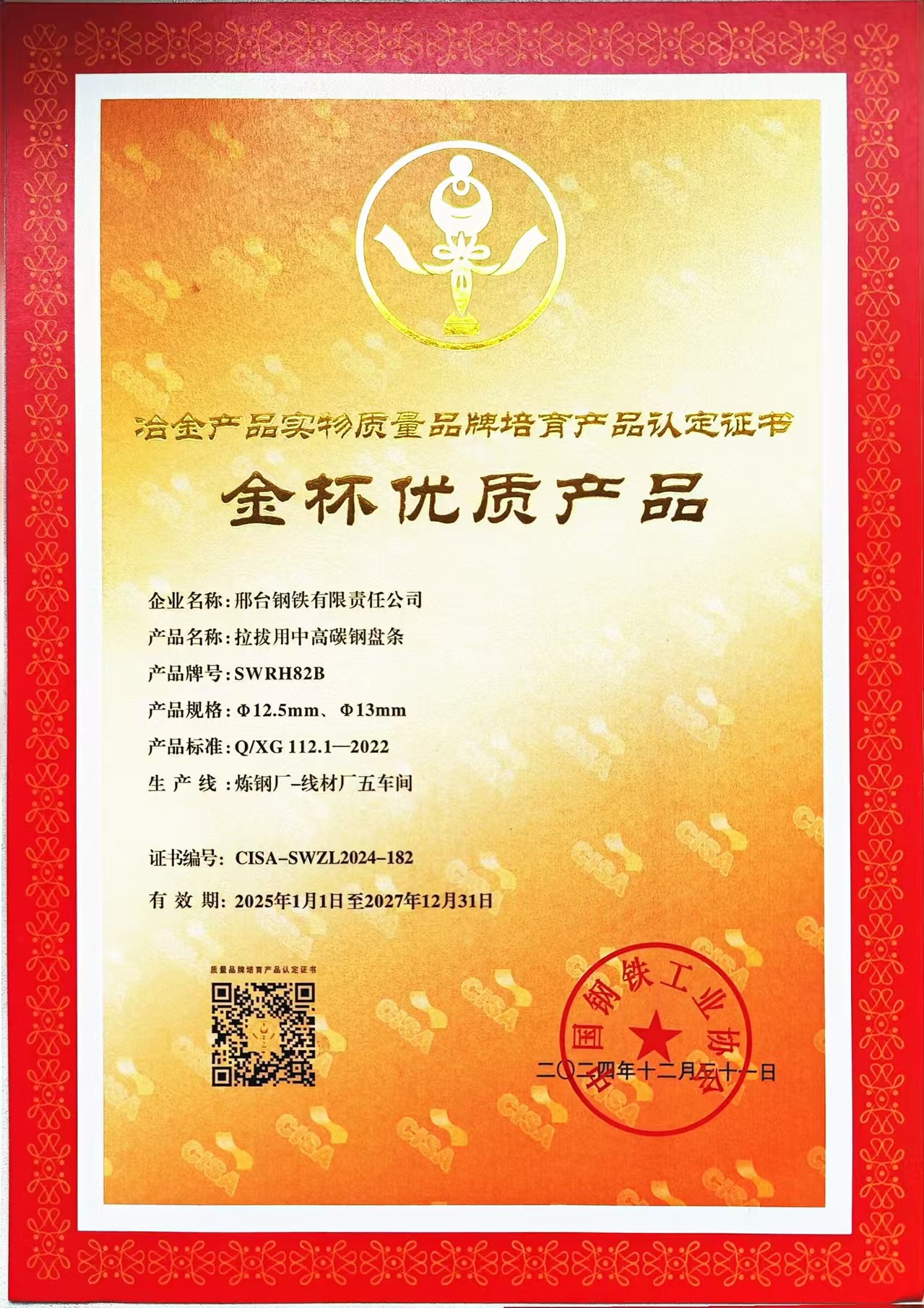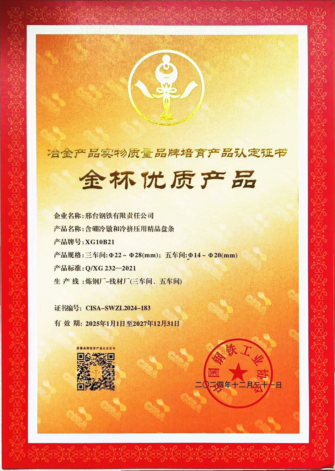 2024年公司含硼冷鐓及冷擠壓用精品盤條XG10B21產(chǎn)品獲得冶金產(chǎn)品實(shí)物質(zhì)量品牌培育產(chǎn)品(金杯優(yōu)質(zhì)產(chǎn)品)認(rèn)定證書,簡稱金杯獎(jiǎng)。“冶金產(chǎn)品實(shí)物質(zhì)量品牌培育”評選活動于24年3月啟動,由中國鋼鐵工業(yè)協(xié)會主辦,金杯獎(jiǎng)是中國鋼鐵工業(yè)協(xié)會組織的冶金行業(yè)唯一的比較權(quán)威的獎(jiǎng)項(xiàng),