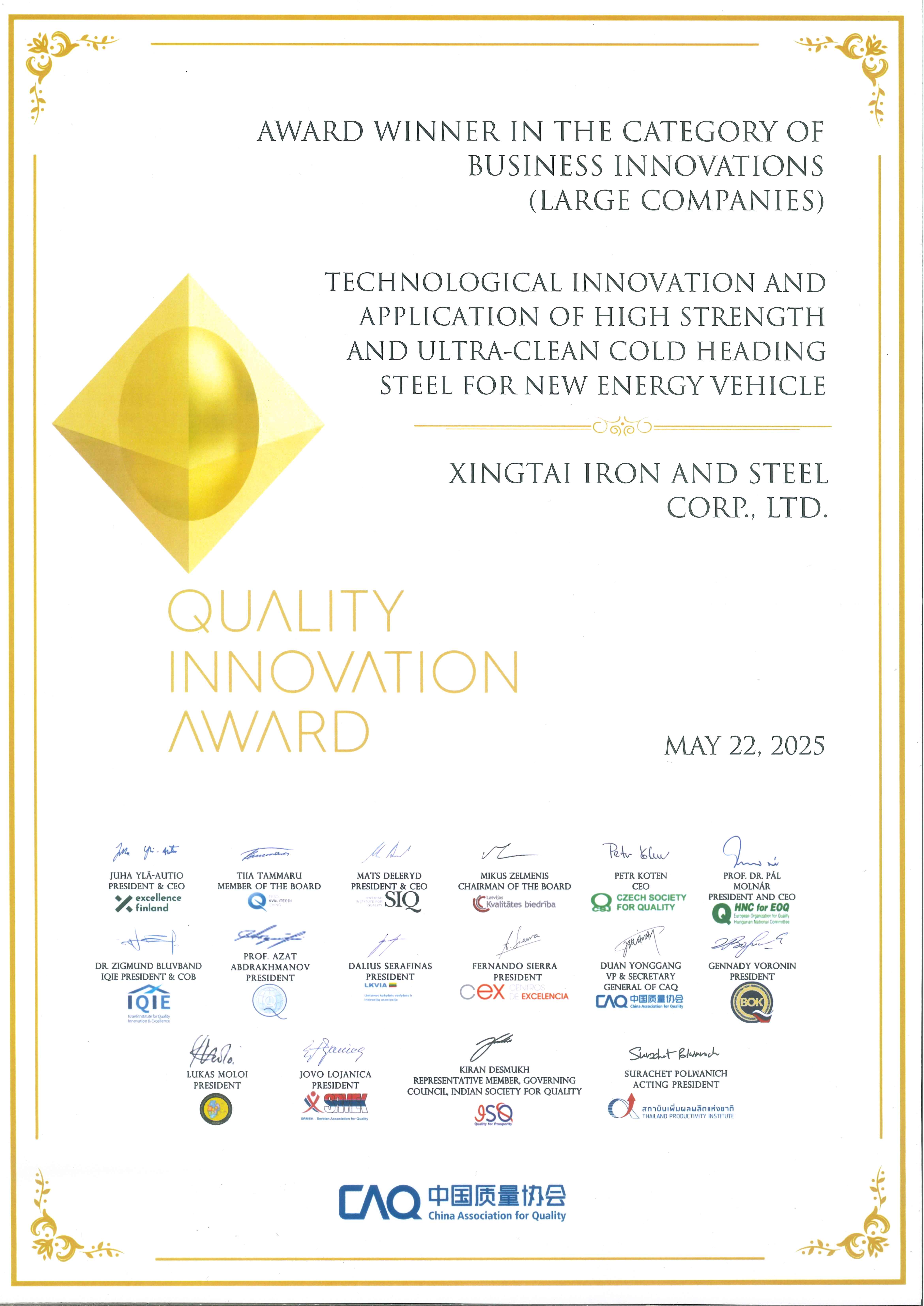 2025.5.22-23邢臺鋼鐵有限責(zé)任公司參加了在泰國舉辦的2024年國際質(zhì)量創(chuàng)新大賽發(fā)布會暨頒獎(jiǎng)儀式,邢臺鋼鐵發(fā)布的項(xiàng)目《新能源汽車用高強(qiáng)度超高潔凈度冷鐓鋼技術(shù)創(chuàng)新及應(yīng)用》榮獲該大賽一等獎(jiǎng)。這是邢鋼歷史上獲得的首個(gè)國際大獎(jiǎng),也是自國際質(zhì)量創(chuàng)新大賽舉辦以來,在鋼鐵領(lǐng)域首次獲得的國際大獎(jiǎng)。