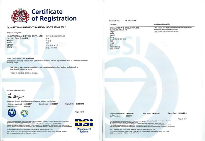 2007年8月24日,邢鋼獲ISO/TS 16949:2002認證證書(國際汽車行業(yè)質量管理體系認證)。