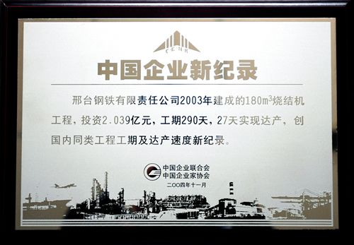 2004年11月,邢鋼2003年建成的180m3燒結(jié)機(jī)工程,投資2.039億元,工期290天,27天實(shí)現(xiàn)達(dá)產(chǎn),創(chuàng)國(guó)內(nèi)同類工程工期及達(dá)產(chǎn)速度新紀(jì)錄。