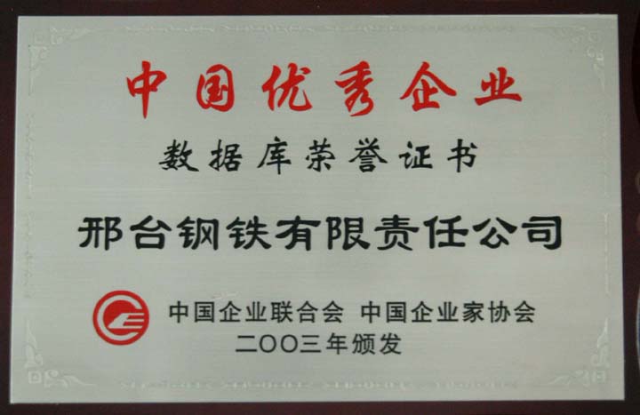 2003年8月,邢鋼被正式選入中國(guó)優(yōu)秀企業(yè)數(shù)據(jù)庫(kù)。
