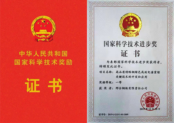 2020年1月10日,2019年度國家科學(xué)技術(shù)獎勵大會在人民大會堂隆重舉行。邢鋼作為主要完成單位之一,完成的《高品質(zhì)特殊鋼綠色高效電渣重熔關(guān)鍵技術(shù)的開發(fā)和應(yīng)用》,喜獲國家科學(xué)技術(shù)進(jìn)步一等獎,系全國鋼鐵行業(yè)十五年來首次獲此殊榮。