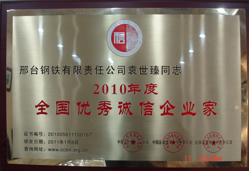 日前,在由中國合作貿(mào)易企業(yè)協(xié)會、中國企業(yè)改革與發(fā)展研究會、全國企業(yè)信用評價辦公室組織召開的中國企業(yè)科學發(fā)展論壇暨誠信表彰大會上,邢鋼被評為2010年度“中國AAA級信用企業(yè)”、公司榮獲“全國文明誠信示范單位” 稱號、董事長、總經(jīng)理袁世臻榮獲“全國優(yōu)秀誠信企業(yè)家” 稱號。