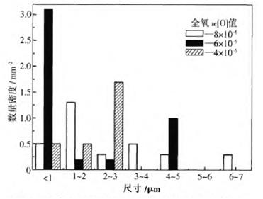 圖2表明,在超低氧范圍內(nèi),隨著全氧含量下降,鋼中尺寸較大的氧化物夾雜顆粒數(shù)量逐漸減少,表明大顆粒夾雜比小顆粒夾雜更容易被去除。