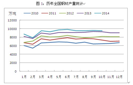 其一,鋼材產(chǎn)量增速有所回落。根據(jù)統(tǒng)計,2014年1-10月,我國粗鋼產(chǎn)量68535萬噸,同比增長2.1%,增速同比減緩7.1個百分點;鋼材產(chǎn)量93447萬噸,增長4.7%,減緩6.9個百分點,國家政策的導(dǎo)向在這其中起了主要作用。一方面,2014年我國從政策上嚴格限制了鋼鐵等產(chǎn)能過剩行業(yè)的投資,由此導(dǎo)致除新疆地區(qū)外,其余省份全年均無高爐新建計劃,鋼鐵新增產(chǎn)能被控制;另一方面,京津冀地區(qū)持續(xù)霧霾天氣引發(fā)了公眾普遍擔(dān)憂,作為全國鋼鐵生產(chǎn)基地的河北省不時由于環(huán)境污染而被強制采取限產(chǎn)措施,雖然對于環(huán)保排污設(shè)施較為齊全的大型鋼廠影響有限,但中小型鋼廠的生產(chǎn)卻受到了較為明顯的影響,全國鋼材整體產(chǎn)量增速下滑也就變得順理成章