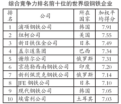 浦項(xiàng)鋼鐵公司在技術(shù)工人熟練程度、技術(shù)創(chuàng)新能力、聯(lián)盟與合資、所在國家風(fēng)險(xiǎn)等方面獲得10分的滿分,但在獲取鐵礦石、煉焦煤等煉鋼原料和能源成本、國內(nèi)市場(chǎng)趨于飽和等方面存在明顯短板,得分也相對(duì)較低,該公司以加權(quán)平均7.91分(滿分為10分)繼續(xù)位居榜首,與去年得分相比沒有變化。