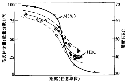 在未淬透的情況下,如何確定工件淬硬層深度呢?從理論上講,淬硬層應(yīng)為全馬氏體組織,但由于金相組織上淬硬區(qū)與非淬硬區(qū)無明顯界限,而馬氏體量由表面到心部是逐漸減少的。實(shí)際上馬氏體中混有一定量非馬氏體組織,如5~10%屈氏體時(shí),在顯微觀察及硬度測(cè)量上都不易察覺。因此,通常將具有50%馬氏體處確定為淬硬層邊界,即從工件表面到50%馬氏體區(qū)的距離定為淬硬層深度,因?yàn)楹?0%馬氏體區(qū)是硬度值急劇變化的地方,如下圖所示: