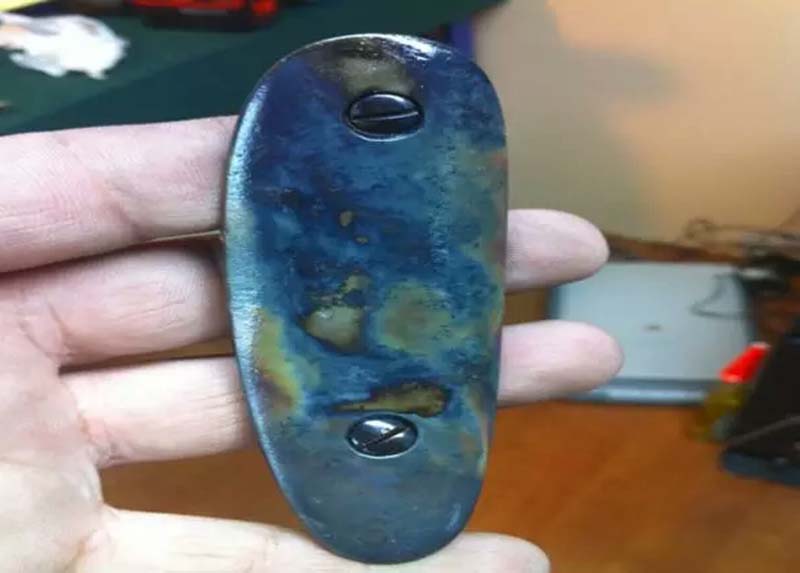 發(fā)藍(lán)(或烤藍(lán))借助化學(xué)方式來完成:有熱、冷、熏、銹等方式,早期的槍支發(fā)藍(lán)處理采用銹發(fā)藍(lán),這個(gè)過程是用酸溶液涂覆槍管部件,讓零件均勻生銹,然后將銹蝕處理(擦洗)掉,留下深藍(lán)色的表面。此工藝經(jīng)常需要幾天時(shí)間完成,而且是非常勞動(dòng)密集型的,現(xiàn)已被主要槍械制造商放棄。