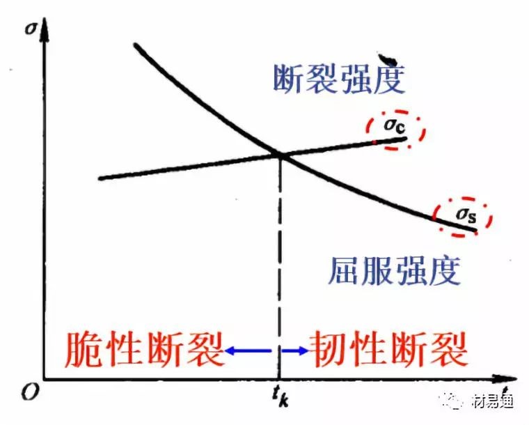 低溫脆性是材料屈服強(qiáng)度隨著溫度的降低急劇增加的結(jié)果;見右圖,屈服點(diǎn)隨著溫度的下降而升高,但材料的斷裂強(qiáng)度隨著溫度的變化很?。粌删€交點(diǎn)對應(yīng)的溫度就是tk。