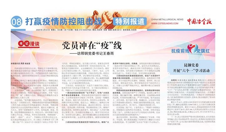 自新冠肺炎疫情發(fā)生以來,邢鋼黨員干部沖鋒在前,充分發(fā)揮基層黨組織戰(zhàn)斗堡壘作用和黨員先鋒模范作用,全力做好疫情防控各項工作,并把疫情防控作為踐行初心使命的戰(zhàn)場,團結帶領邢鋼全體員工迅速打響疫情防控阻擊戰(zhàn)。