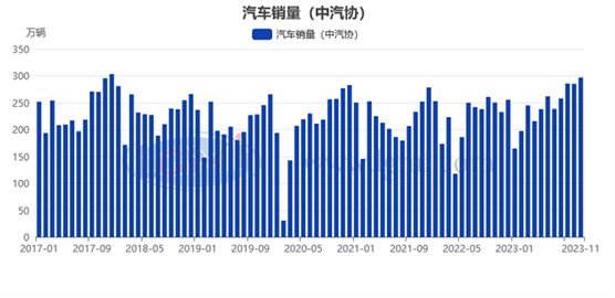 據(jù)中國汽車工業(yè)協(xié)會統(tǒng)計數(shù)據(jù)顯示,2023年11月份,汽車產(chǎn)銷分別達到309.3萬輛和297萬輛,環(huán)比分別增長7%和4.1%,同比分別增長29.4%和27.4%,產(chǎn)銷量連續(xù)3個月創(chuàng)當(dāng)月歷史同期新高。1-11月,汽車產(chǎn)銷累計完成2711.1萬輛和2693.8萬輛,同比分別增長10%和10.8%。