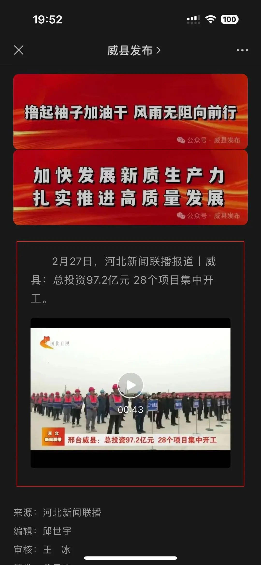 去年以來,威縣錨定抓招商、上項目、優(yōu)環(huán)境,成功引進(jìn)了一批大好高優(yōu)項目,有力推動了縣域經(jīng)濟穩(wěn)健高質(zhì)量發(fā)展。去年簽約項目87個、總投資120億元,引進(jìn)央企子公司6家,邢鋼搬遷項目開工建設(shè)、吉利新能源商用車整車下線、春立正達(dá)醫(yī)療器械等重大項目投產(chǎn),高新區(qū)成功擴區(qū),新增可利用土地1.3萬畝,縣域科技創(chuàng)新能力評價躍升為全省A類。