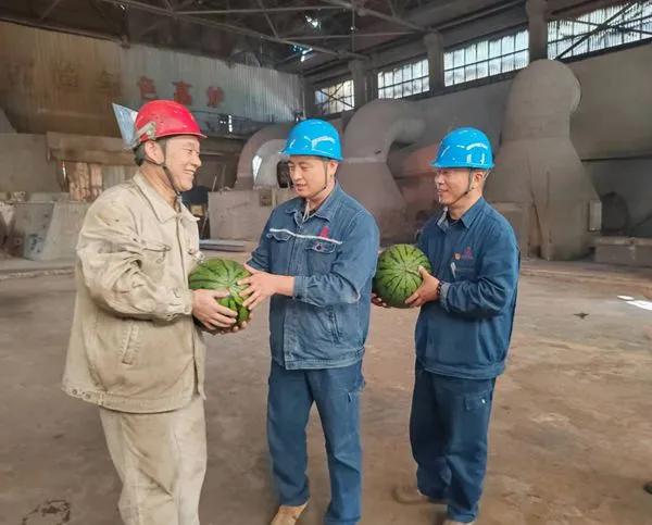 “天氣炎熱,大家辛苦了”,在爐前,侯副總親自把西瓜送到員工手里,并送上節(jié)日的祝福“端午安康!”希望大家在工作中注意做好防暑降溫,避免中暑,工作中合理分配體力,既要保證西場(chǎng)主溝澆筑過程安全,又要保證東場(chǎng)單場(chǎng)出鐵過程安全。在二燒混合機(jī)檢修現(xiàn)場(chǎng),侯總了解檢修進(jìn)度,叮囑維修、燒結(jié)車間主任,要注意檢修過程人員安全,保證檢修質(zhì)量,為二燒設(shè)備穩(wěn)定運(yùn)行奠定基礎(chǔ)。
