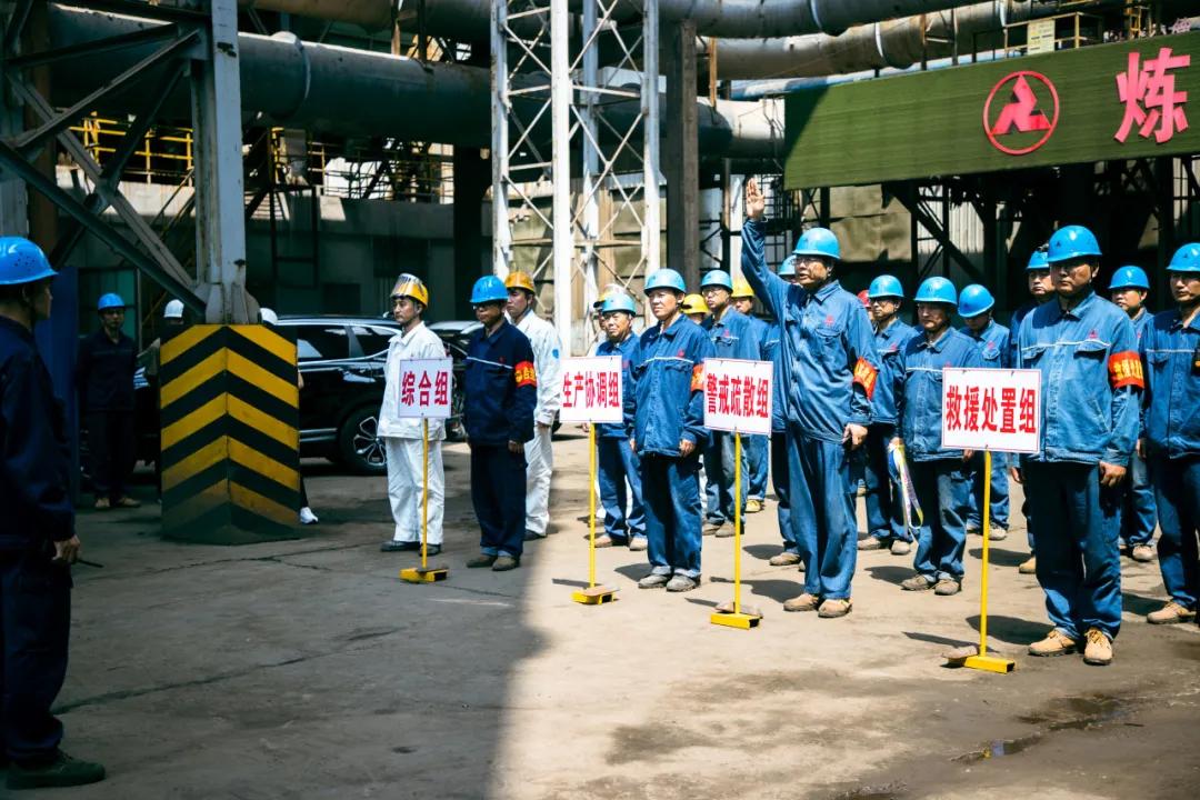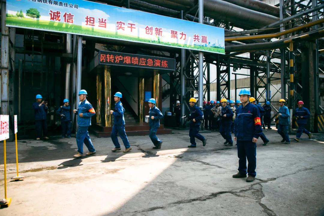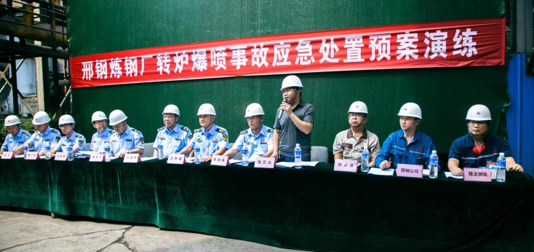 隨后,參會人員一起現(xiàn)場觀摩了邢鋼高溫熔融金屬爆噴事故現(xiàn)場應急處置演練。本次演練,模擬煉鋼廠加料跨天車向2#轉(zhuǎn)爐加廢鋼時發(fā)生爆噴為背景,演示了事故上報、安全疏散、預案啟動、現(xiàn)場搶險、應急救援等環(huán)節(jié)。